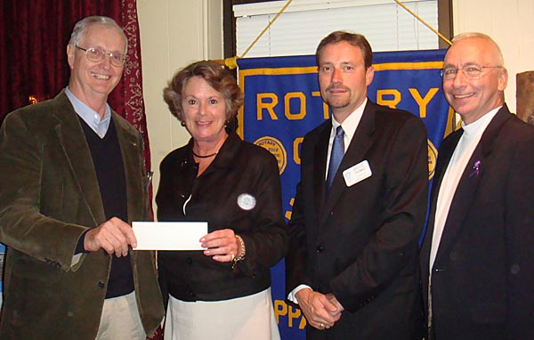 Rotary Club supports new Haven Shelter facilities for victims of violence October 25, 2007 - Rotary Club of Tappahannock President Richard Lyman (left) donates a $1,000 check to Haven Chair Suzanne Rennolds who presented a program about the Haven's work with victims of domestic violence and sexual assault in the community. Rotary Club program host Bruce Thomas and Haven Treasurer John Clickner (far right) introduced the speaker and announced the opening of the new larger capacity Haven facility in Warsaw that serves victims from the counties of Essex, Richmond, Lancaster, Northumberland and Westmoreland. |